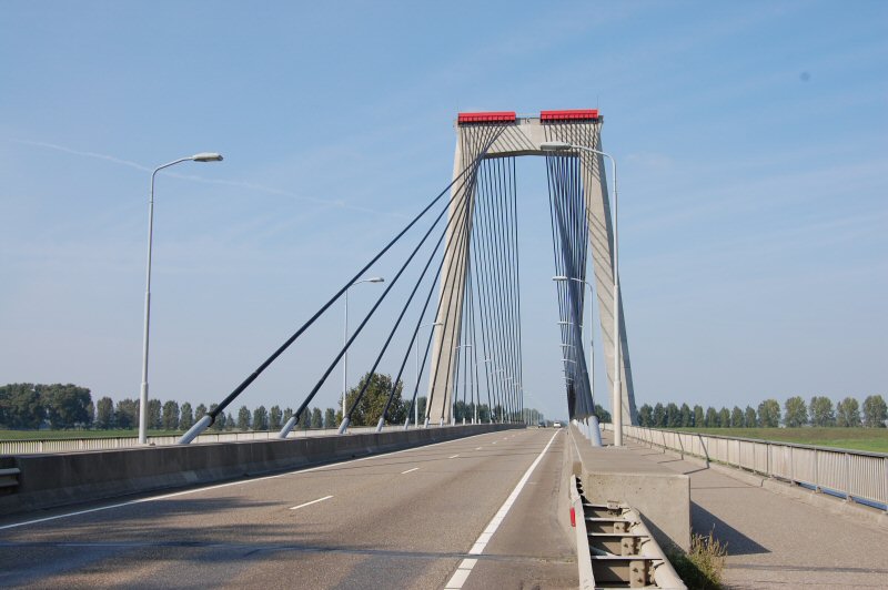 Na de brug van Hedel de andere oever van de Maas. Een verlengde spits was in de afvaart. Opvallend weinig vlaggen halfstok bij de dijkbebouwing. Na Well wordt de noordzijde van de Afgedamde Maas aangedaan. Café Maasstroom is nog in diepe rust. De aanwakkerende wind soms mee en vaak tegen op de kronkelende dijk. Na de Wilhelminasluis, de enige waaiersluis in Nederland met een groene kolk, kwam voor ons de wind vaker uit de gunstige hoek. Bij Almkerk was het golfterrein verlaten. Onderweg naar Hank deed Mario een Frank Rijkaardtje, een volle fluim werd onhandig de lucht in gespuugd. Gelukkig geen Rudi Völler in de buurt. In volle vaart werd de brug van Keizersveer genomen. In Oosterhout ging ieder zijn eigen weg. Jammer dat Mario niet een stukje mee reed naar het centrum. Nu miste hij het mooiste van de dag, zijn temperatuur zou wederom opgelopen zijn en het bloed zou stuwend werk hebben verricht.